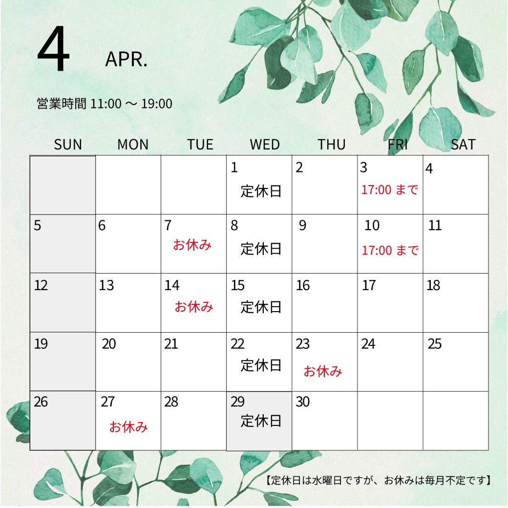 - 【2026. 4月お休みのお知らせ】