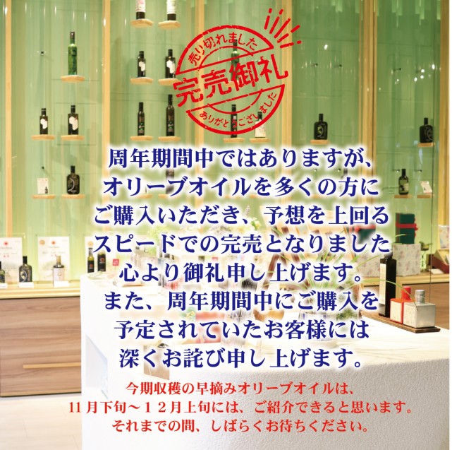 6周年期間中ではございますが、オリーブオイルをたくさんのお客様にご購入いただき、予想を上回るスピードでの完売となりました。